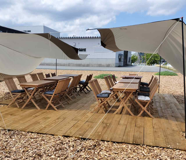 第1回目のブログは、昨年8月に完成した米沢工場のバーベキュースペースをご紹介したいと思います。米沢工場の駐車場隣に木材チップと枕木を敷いて作った屋外休憩用のスペースで、テーブルや椅子、テントはコンテナに収納しています。